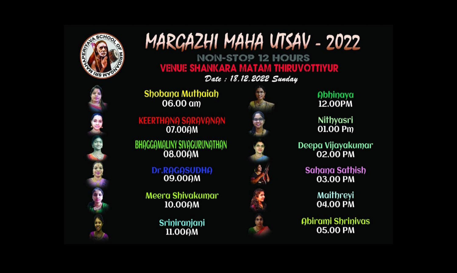 On 18th Dec 2022, Maha Periyava School of Mridangam conducted an outstanding event "Margali Uthsav" to play 12 hours of non-stop music concerts by 12 renowned artists at Chennai.